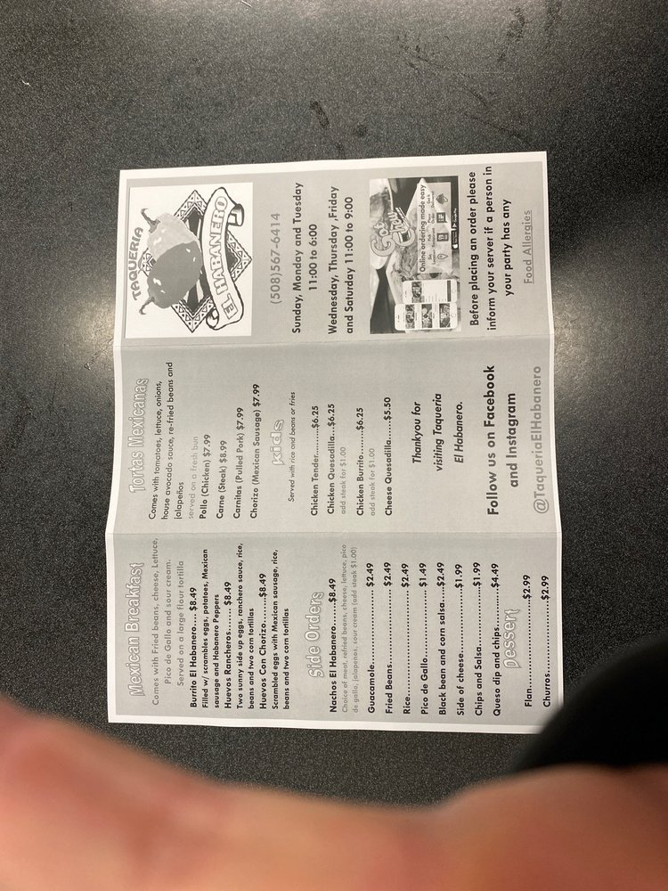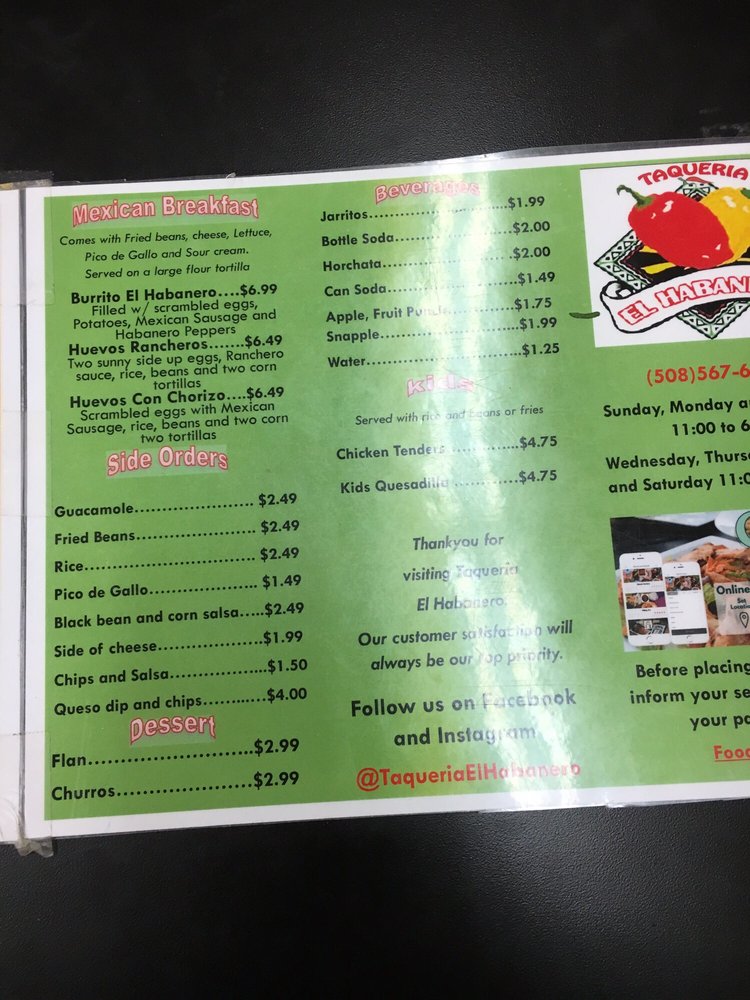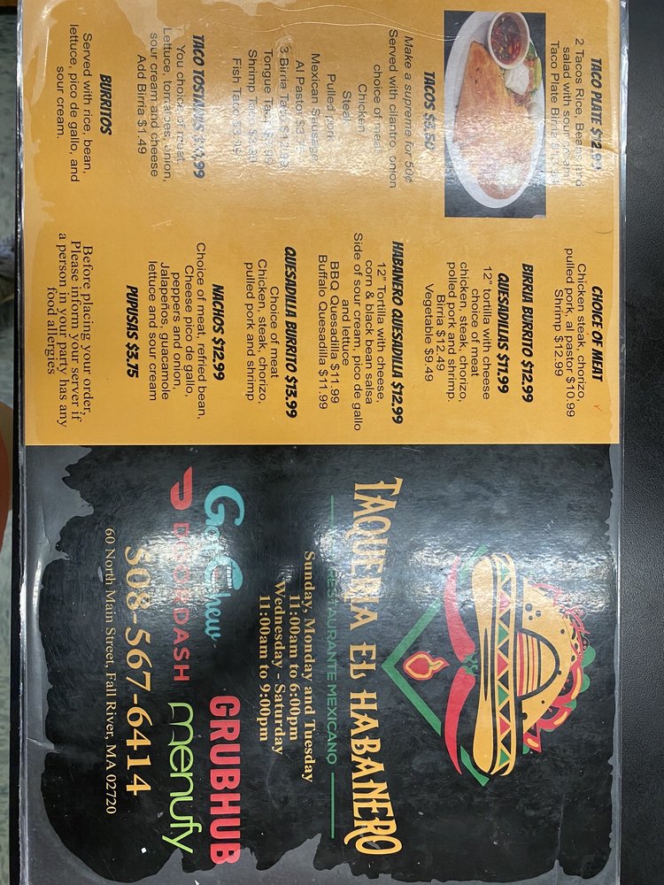 Taqueria El Habanero located in Fall River, MA offers a delectable selection of Mexican cuisine. With options for both meat lovers and vegetarians, this casual spot is ideal for groups and families. Their menu features mouth-watering tacos like the Pollo Taco Chicken and Birria Taco, along with flavorful quesadillas such as the Habanero Quesadilla. The Platos Especiales, like the Carne asada Plato and Camarones al ajillo, showcase the restaurant's commitment to authentic flavors. Customer reviews rave about the authenticity and deliciousness of the food, with praises for the attentive service. If you're in the mood for top-notch Mexican fare, Taqueria El Habanero should be your go-to spot.
